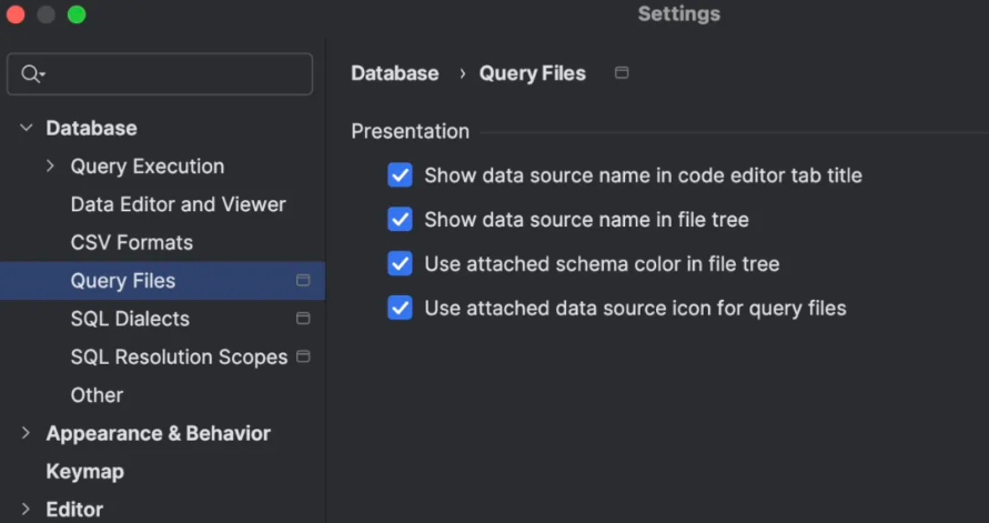 在 IDE Settings(设置)对话框中的 Database * Query Execution * Query Files(数据库 * 查询执行 * 查询文件)下实现了多项显示设置。用户可以使用这些设置确保在需要的位置准确显示查询文件详细信息。