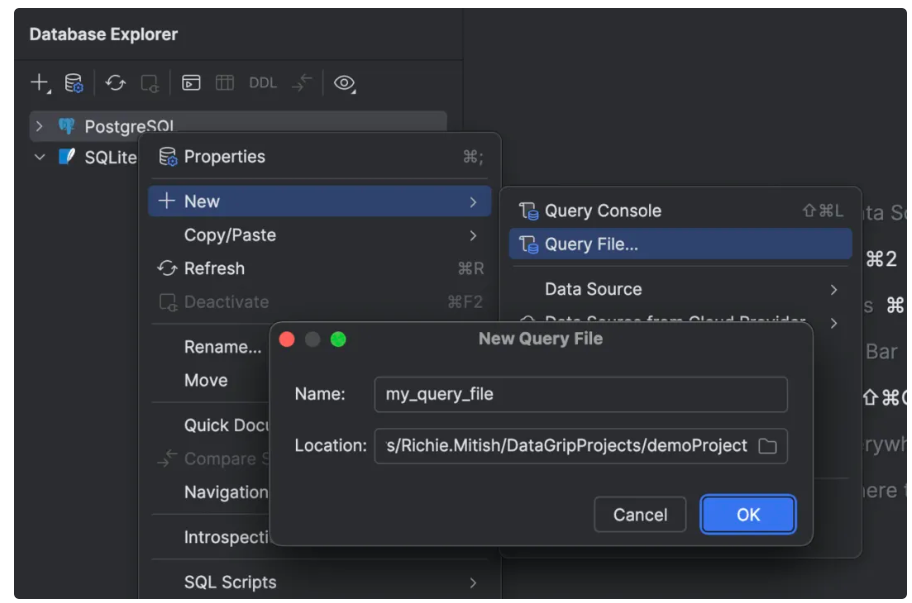 在此版本中重新设计了并行使用查询文件和查询控制台的流程。这样一来,用户可以根据任务和工作流选择使用其中一个或同时使用两者。已实现创建查询文件的新方式,允许用户自行定义文件名和位置。默认情况下,文件会在当前项目目录中创建并与项目关联。