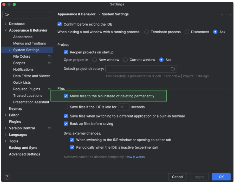 现在可以选择 Delete(删除)操作的行为。IDE 可以将文件移至回收站,也可以将其永久删除。要定义此行为,建议转到 IDE Settings(设置)对话框,导航到 Appearance & Behavior * System Settings(外观与行为 * 系统设置),然后切换 Move files to the bin instead of deleting permanently(将文件移动到回收站,而不永久删除)设置。此设置默认启用。