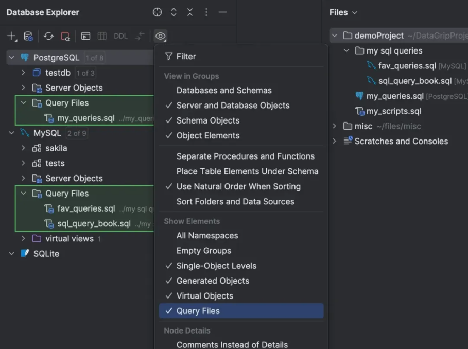接下来,所有附加到数据源的查询文件都会显示在数据库资源管理器的 Query Files(查询文件)文件夹下。这可以简化导航,并帮助用户专注于数据源的上下文。