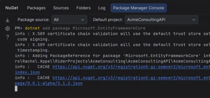 可以在工具窗口或终端中直接运行标准的 NuGet 和 Entity Framework Core 命令,无需在不同工具间频繁切换。更多此功能介绍可参阅此处(英文)。