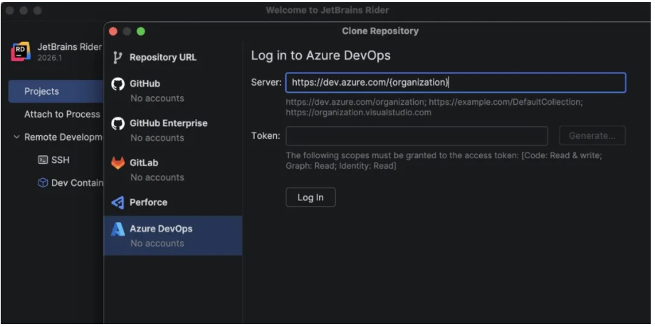 - Azure DevOps 集成:支持通过内置插件直接从云端克隆仓库,利用个人访问令牌快速身份验证。
