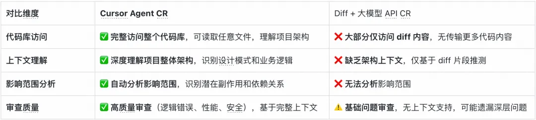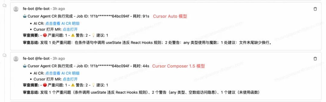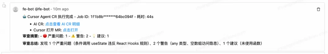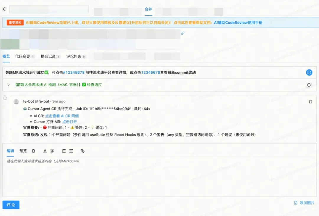 - 对于 MR 评审人员,如果希望通过 Cursor CR 时,需要在本地通过调用 CR 智能体再执行一遍,获取 CR 结果,在目前 Cursor 按量计费的背景下,重复执行 CR 智能体的成本需要及时关注。