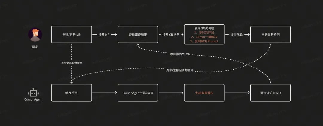 - 当研发创建 MR 后,流水线配置了 AI CR 检测流水线后,将会自动触发 Cursor Agent CR 任务。