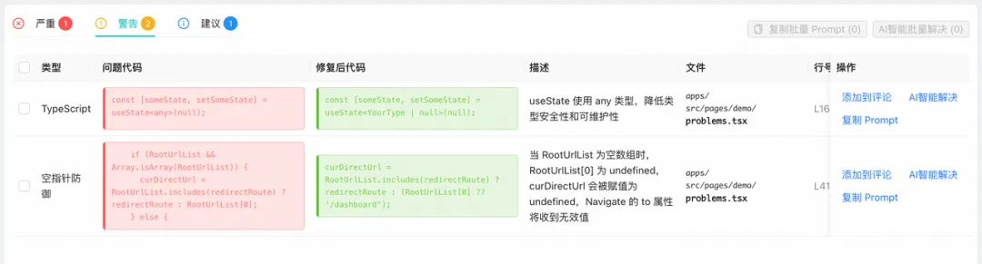 首先报告列表会对问题进行聚类,分为严重问题、警告、建议三类,切换对应 Tab 可以看到问题列表。具体的问题信息,主要有类型、问题代码、修复后代码、描述、文件路径、行号、操作等列。