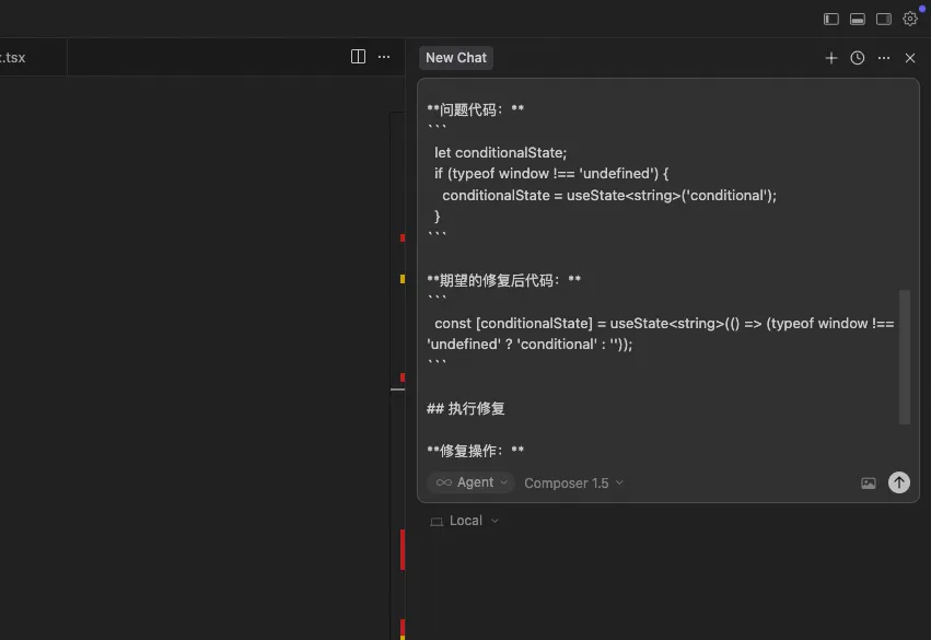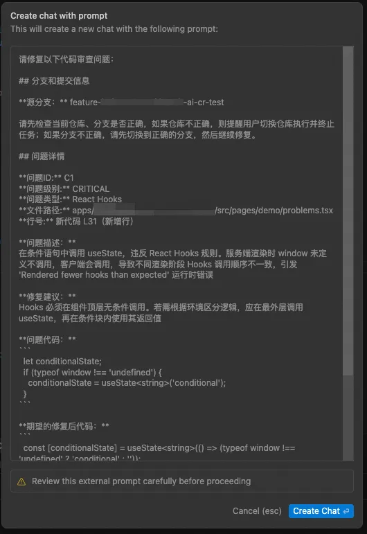 点击操作列的 Cursor 解决,将会一键将相关问题的信息,生成解决问题 Prompt,一键打开本地 Cursor ,创建 Agent 对话去解决问题。打开链接后,Cursor 会先接收 Prompt ,你可以简单浏览下,点击 Create Chat ,即可一键创建 Chat,回车执行修复。