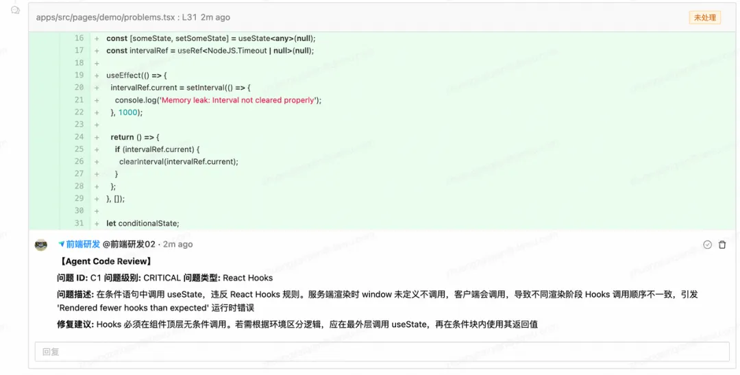 发布前最后的人工 CR 可以通过前置的 AI CR 发现与问题前置解决,大幅提升靠最后人工 CR 的反馈、修改等环节效率。特别是当业务需求代码量较大时,人工 CR 浏览的效率和质量也是无法保证的。