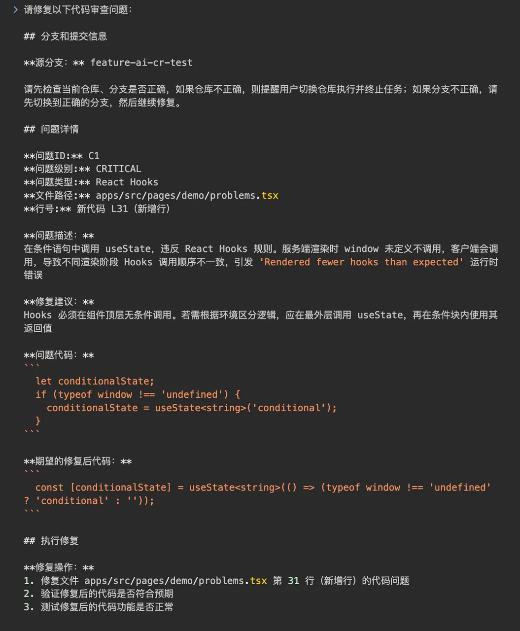 研发收到 AI CR 报告的通知后,可以及时打开 CR 报告查看,确认反馈的疑问点是否需要调整,如果需要调整可以通过 Cursor 一键解决,将问题解决前置到提测以前,这样所有的改动可以尽可能的被测试同学验证到。