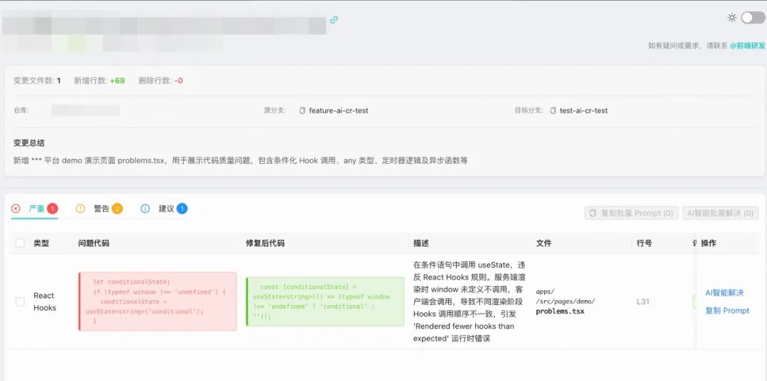 当需求分支第一次提交后,就可以创建到 release 或 test 目标分支的 MR 了,后续每次提交代码都将会自动触发检测,产出 AI CR 报告。