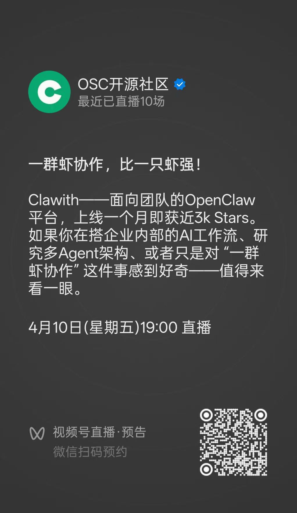 4 月 10 日晚 7 点,OSCHINA 开源中国将邀请 BISHENG / Clawith 联合创始人覃睿,与大家分享 Clawith 台前幕后的故事,以及广大开发者感兴趣的技术细节,当然还有现场演示真实的多 Agent 协作场景 —— 多只虾如何在没有人工介入的情况下完成一次完整的跨角色任务协同 —— 不是 PPT,是跑起来的系统!