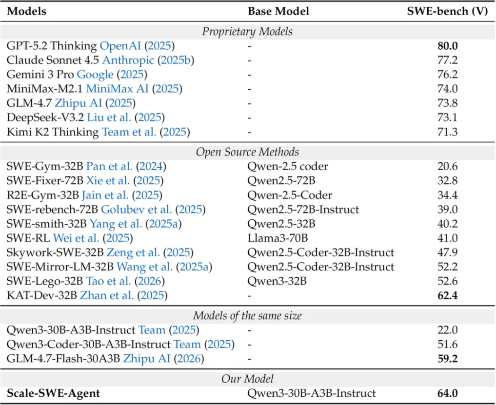 为了验证 Scale-SWE 数据的效果,研究团队使用 DeepSeek v3.2 进行蒸馏。得到 71k 条成功轨迹,并基于 Qwen3-30B-A3B-Instruct 进行 SFT。结果如下: