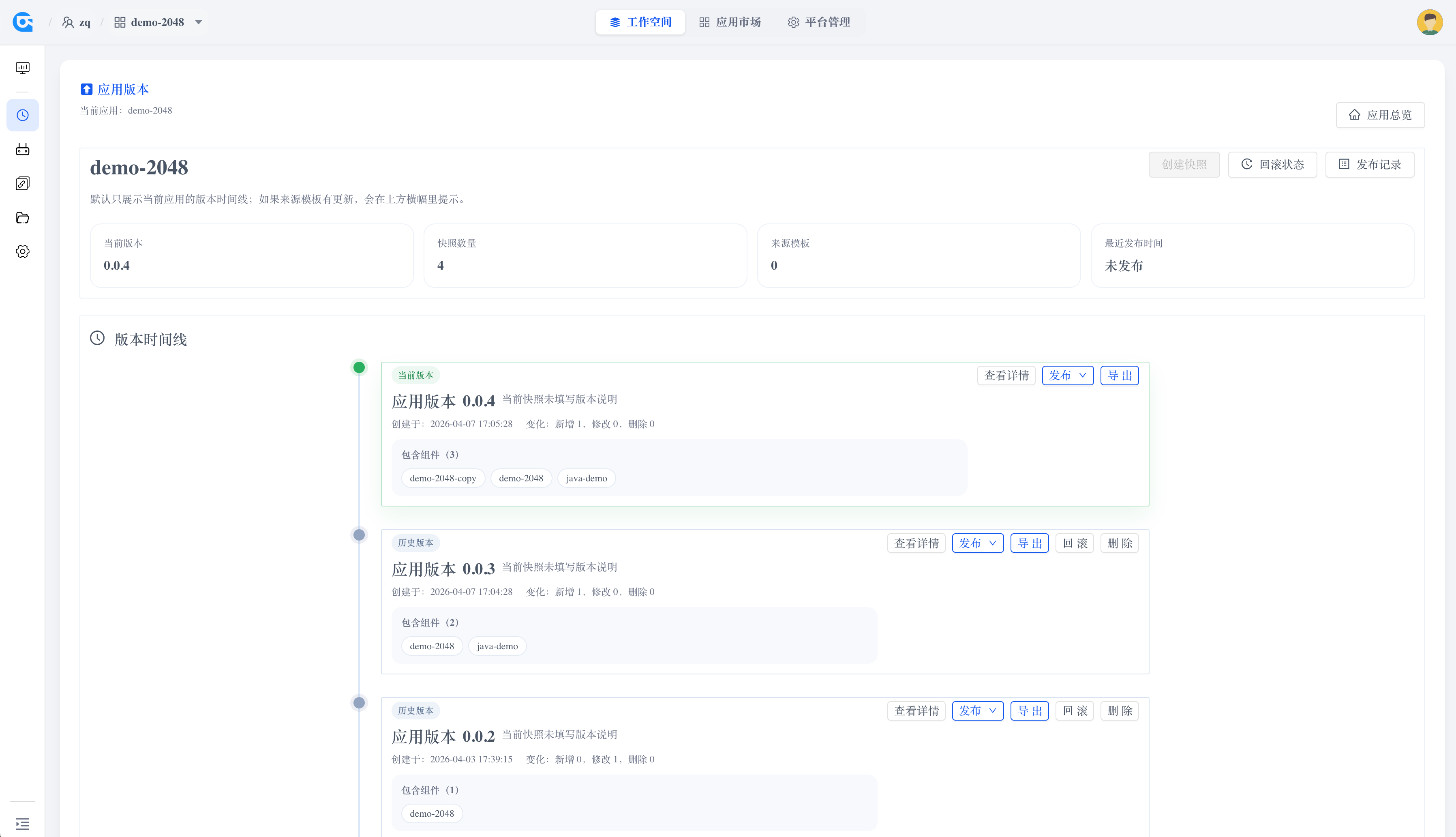 - 在应用运维侧,新增 应用快照,补齐应用版本留档、导出、发布和回滚能力