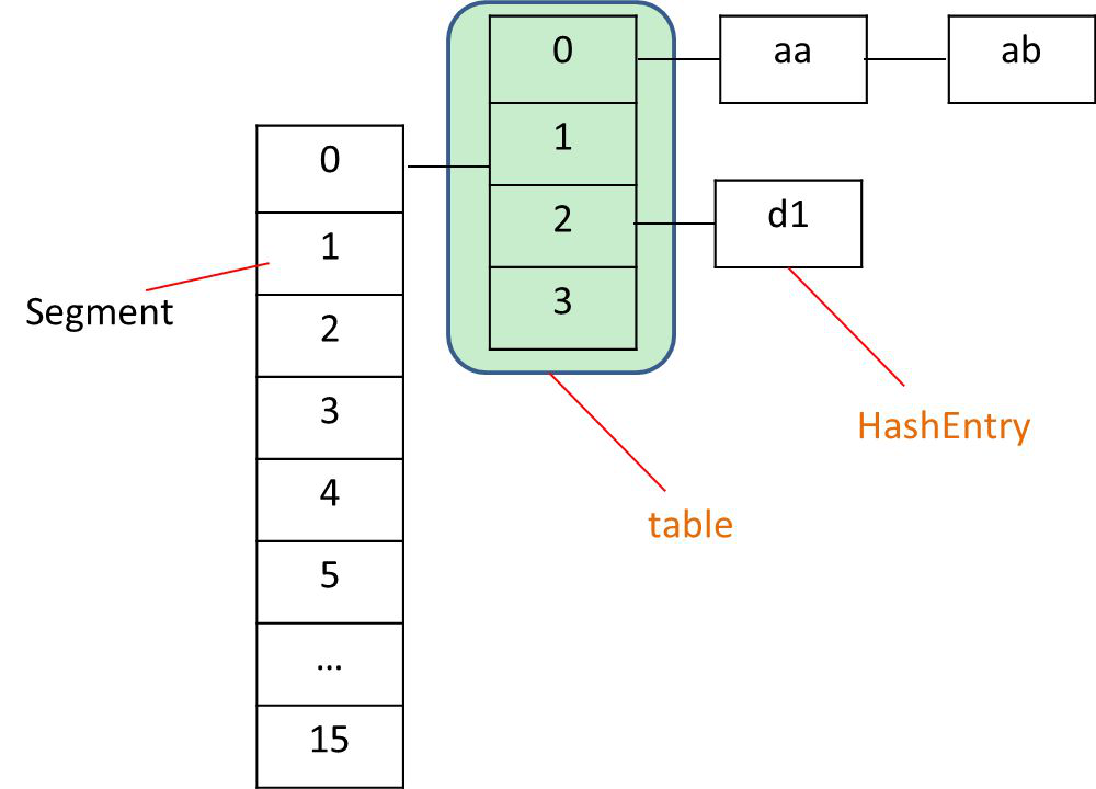 采用Segment数组结构和HashEntry数组结构组成,Segment数组的大小就是ConcurrentHashMap的并发度。Segment继承自ReentrantLock,所以他本身就是一个锁。Segment数组一旦初始化后就不会再进行扩容,这也是jdk1.8去掉他的原因。Segment里面又包含了一个table数组,这个数组是可以扩容的。