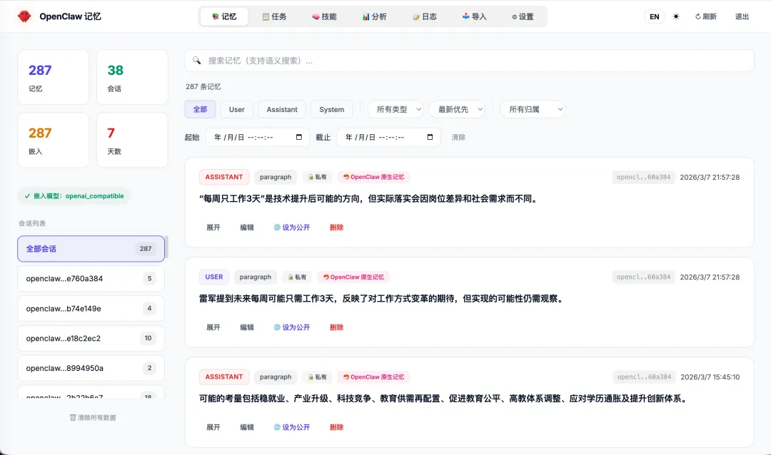 所有通过迁移导入的记忆都带有 🦐 标识,在 Viewer 中一眼就能和新对话生成的记忆区分开。