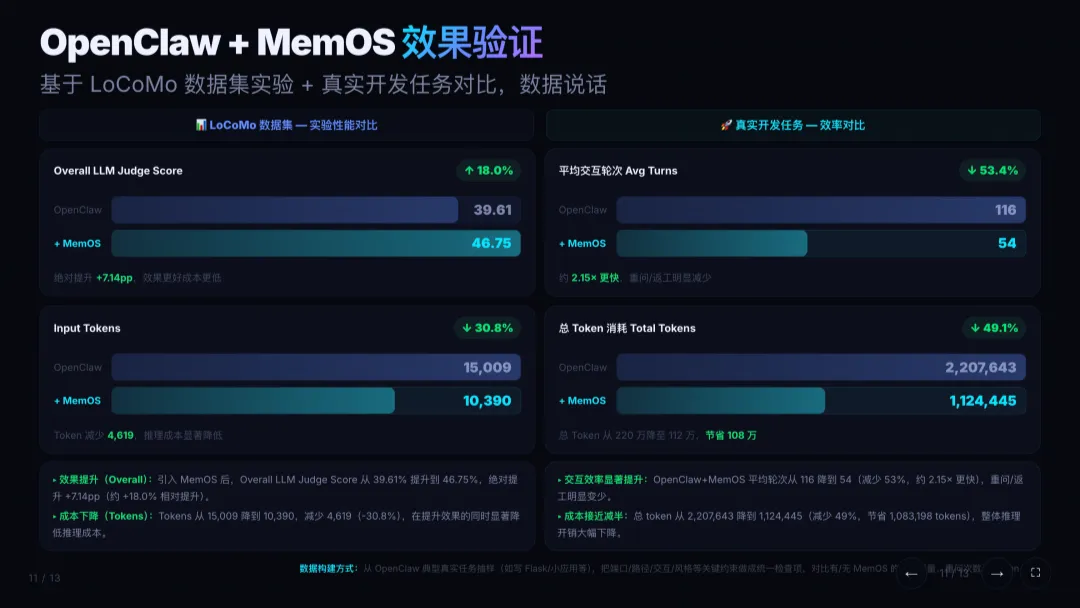 我们基于 LoCoMo 数据集实验与真实开发任务,对引入 MemOS 前后的 OpenClaw 做了系统性对比。