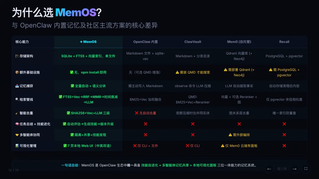 相比 OpenClaw 内置记忆以及社区其他方案,MemOS 不需要额外部署数据库或复杂基础设施,一条命令即可安装使用,并且是目前少数同时具备任务自动总结、技能进化、多 Agent 协同、团队知识中枢和本地可视化管理的一体化记忆系统。