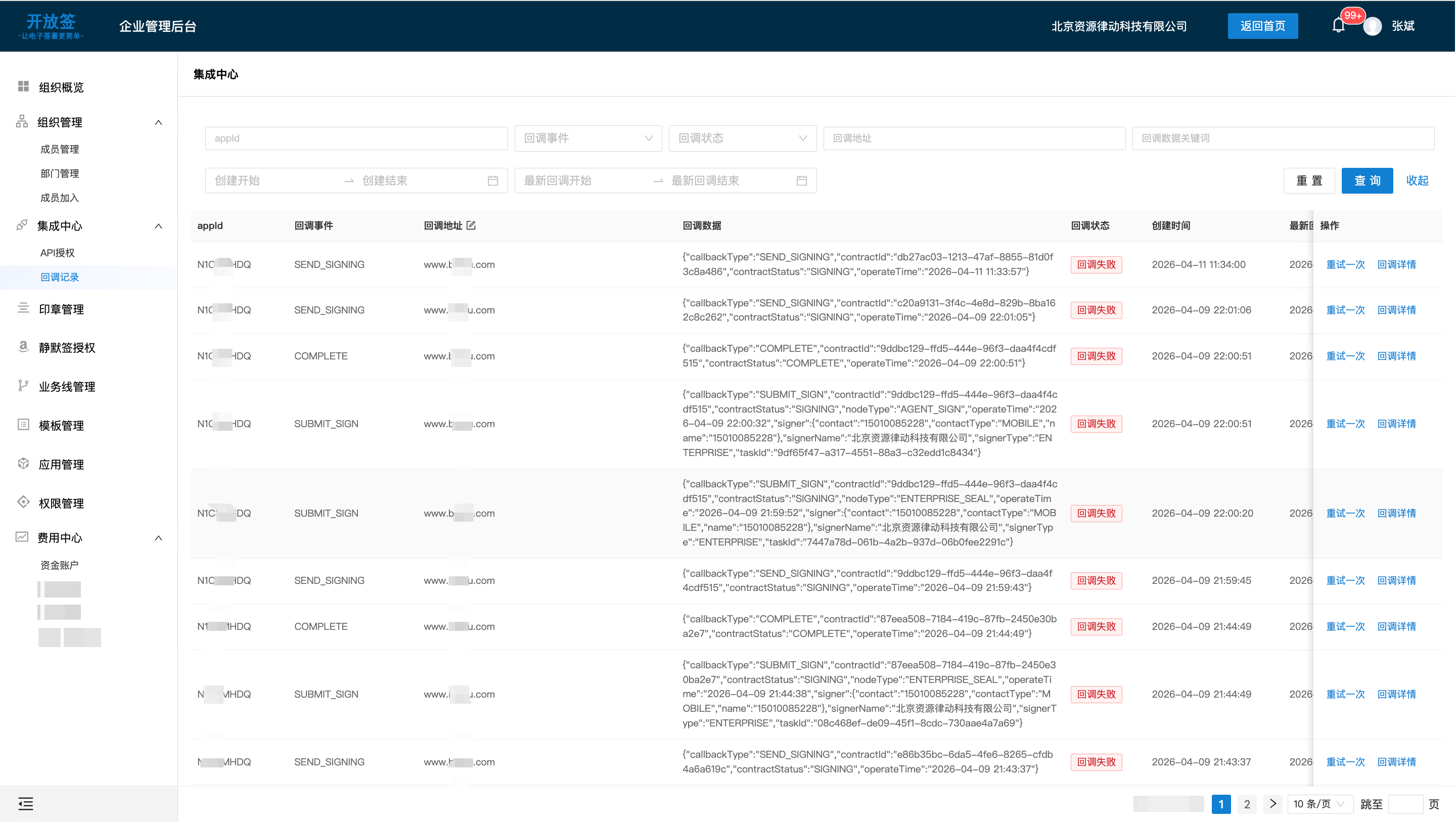 为企业身份与运营管理端新增集成管理模块,统一管理API授权凭证与回调事件记录。