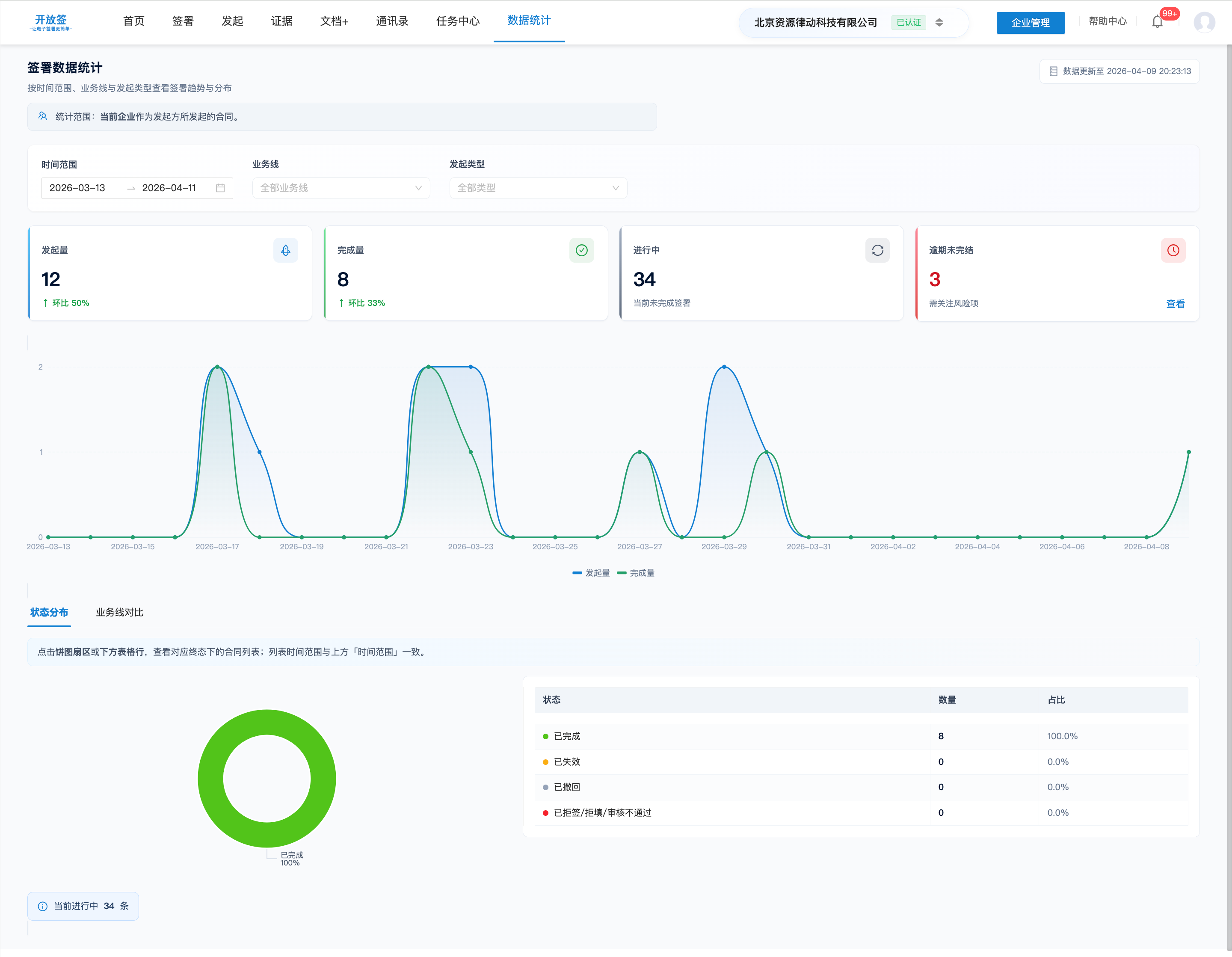 为企业身份新增数据看板,支持多维度签署数据统计、下钻分析及明细数据导出。