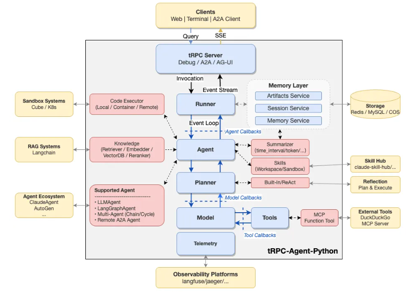 tRPC-Agent-Python 提供从 Agent 构建、编排、工具接入、会话记忆,到服务化部署与可观测的完整能力,帮助你快速落地可运行、可扩展、可维护的智能体应用。