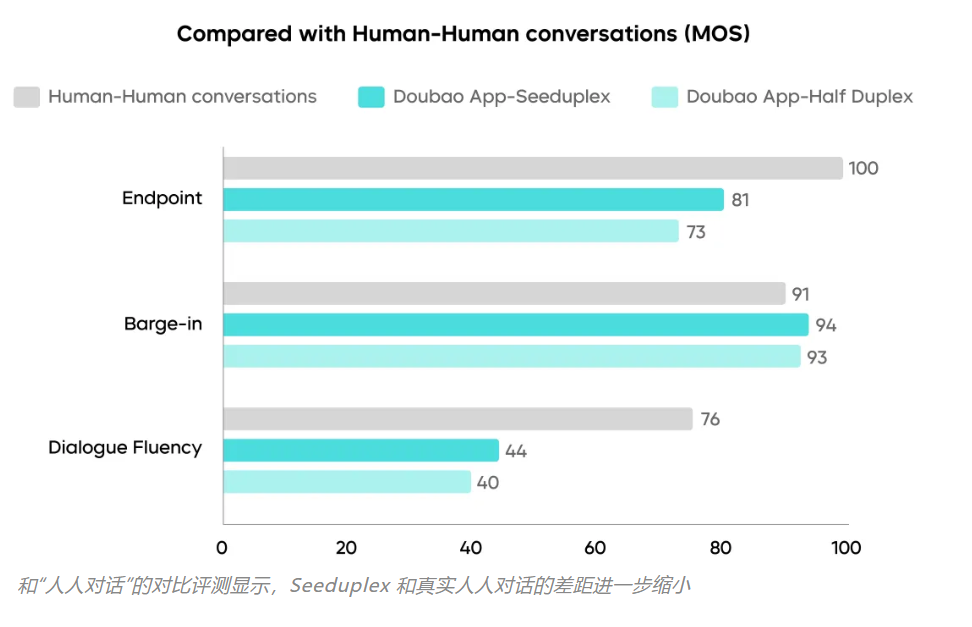 项目团队还通过组织真人对话测试,初步摸底了目前人机对话相对真实人人对话(普通人群)的水位。结果显示,以“人人对话”为基准,Seeduplex 在判停表现上相比半双工方案显著提升了 8%。而在响应打断的表现上,真实人人对话有时在响应上相对滞后,Seeduplex 则表现更稳定,略好于人人对话的平均水平。但在整体对话流畅度上,Seeduplex 和真实人人对话仍有不小差距,有待进一步提升。