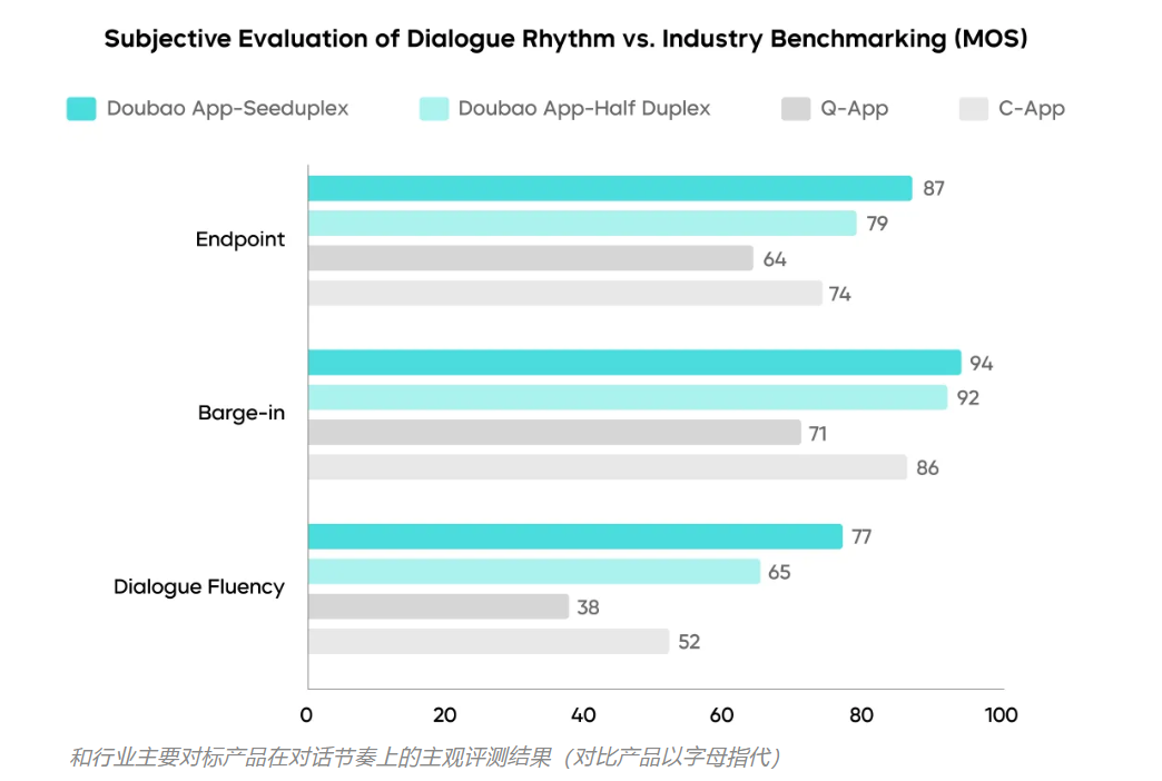 另外,通过与原半双工模型以及行业主流 App 语音通话功能的横向对比,Seeduplex 在判停、打断响应任务上展现出明显优势,并显著提升了评测用户对整体交互节奏是否合理的对话流畅度评价。