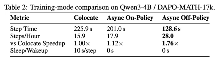 在2机16卡 DAPO-Math 任务上较 veRL 提速 20%!加速来源于:流式微批调度消除全局 batch 同步瓶颈,资源分离将前向推理计算完全掩盖,消除 sleep/wakeup 开销。