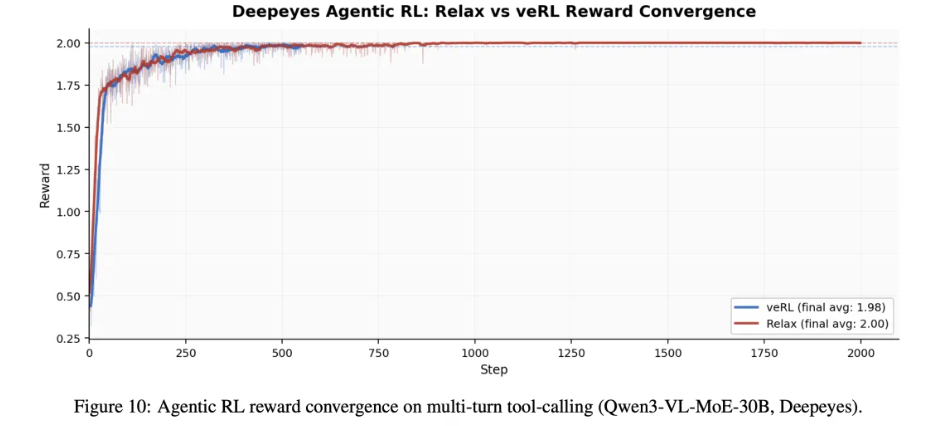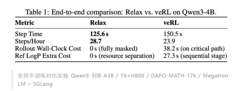根据介绍,Relax 基于 Megatron-LM 和 SGLang 高性能后端构建,以协同设计为核心理念,将全模态数据支持、服务化容错架构和异步训练流水线三个维度统一解决。在 Qwen3-Omni-30B 上,Relax 验证了图像、文本、音频和视频四种模态的 RL 训练稳定收敛;在 16xH800 多机下,训练全异步相比 Colocate 基线端到端提速 76%,相比 veRL 的全异步端到端提速 20%。
