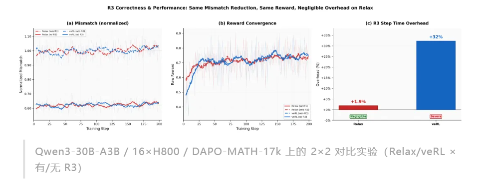 Relax 实现了性能近无损退化版的 R3(Rollout Routing Replay)。在Qwen3-30B-A3B 下 mismatch 降低 38%,仅增加 +1.9% 的额外耗时,而 veRL 开启 R3 后端到端耗时增加了 34%。Relax 通过重写序列化路径(把路由数据从 pickle 通道拆出来,走 NCCL 原生广播)和 GPU 驻留式的异步传输,使 R3 的数据传输和 replay 开销极低。
