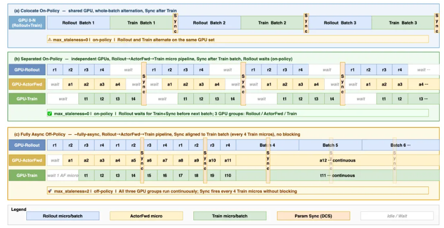 - 流式微批调度(Streaming Micro-Batch Scheduling):传统框架采用全局 batch 同步——rollout 必须生成整个 batch 后才能交付下游,比如一个 20k token 的长尾样本可能就会阻塞整个 step。Relax 将全局 batch 拆分为微批,每个微批完成后立即写入 TQ 供下游消费。