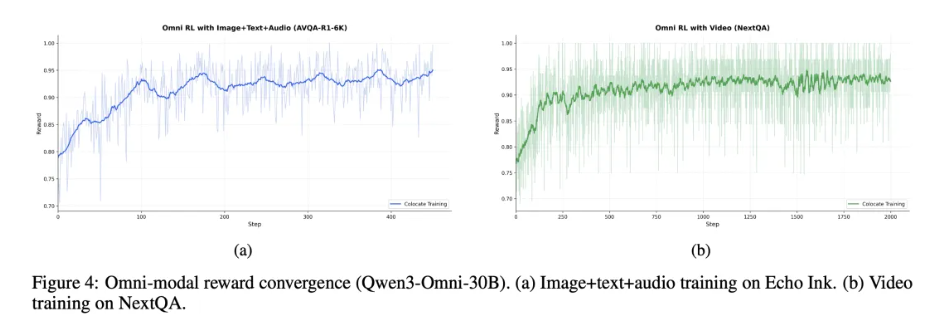 Relax 支持图像、音频、视频等输入的统一处理与灵活接入,结合模态感知并行与端到端异步流水,提升多模态训练效率与可扩展性。在 Qwen3-Omni-30B 上,分别基于图文音频数据(AVQA-R1-6K)和视频数据(NextQA)进行 RL 训练(其中视频数据持续训练 2,000+ 步稳定收敛)