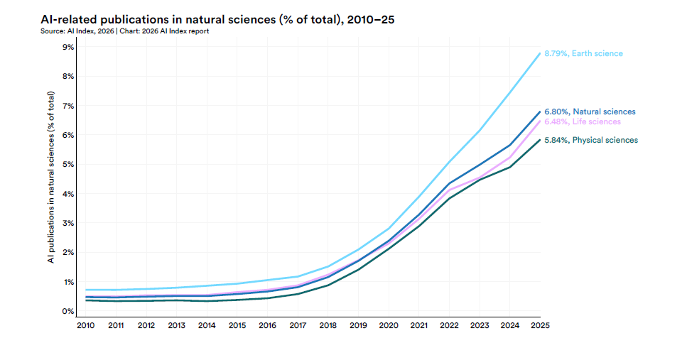 近期,斯坦福大学发布了备受瞩目的《2026年人工智能指数报告》(AI Index Report 2026)。在报告的“科学篇”中,一个数据引发了广泛关注:“到2025年,地球科学的AI渗透率最高,达到8.8%,其次是自然科学整体(6.8%)、生命科学(6.5%)和物理学(5.8%)。” 这一跨越式增长不仅表明人工智能已从边缘工具跃升为核心驱动力,更揭示了地球科学正在经历一场深刻的数字化与智能化重塑。