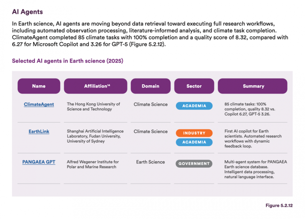 在地球科学领域,AI智能体正超越单纯的数据检索,迈向执行完整的科研工作流。报告列举了多个代表性项目: