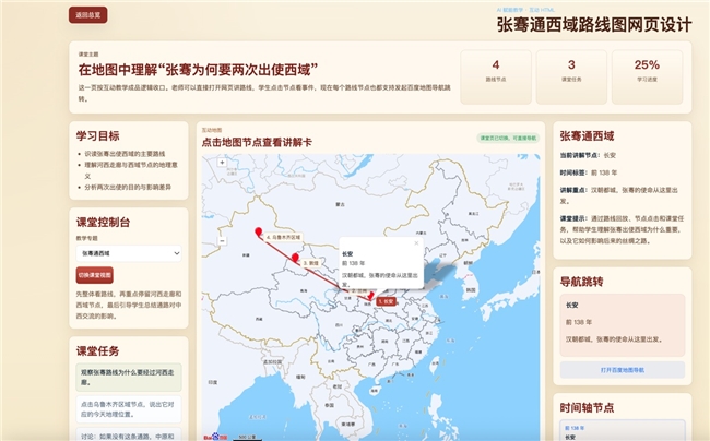 自动解析“张骞两次出使”的教学目标 → 拆解为路线节点、时间轴、课堂任务