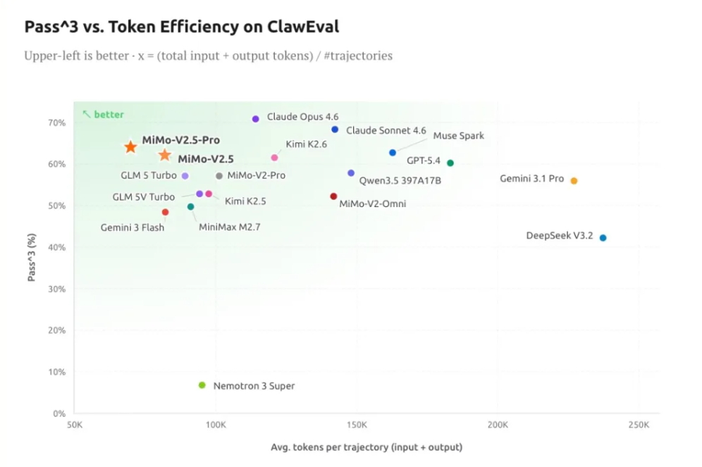 MiMo-V2.5 全系列针对 Token 效率进行优化,用更少的 Token 做更多的事。在达到相同 Agent 基准榜单 ClawEval 分数情况下: