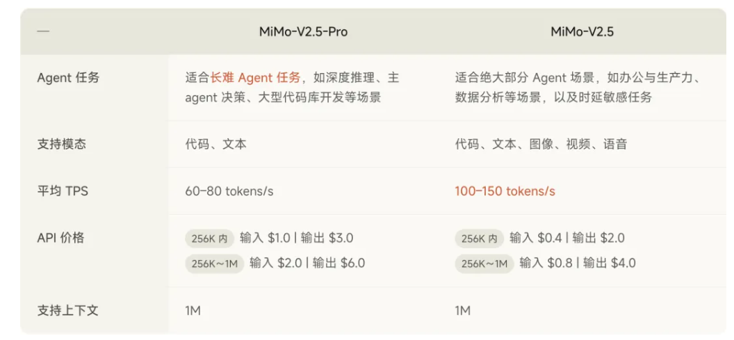 Xiaomi MiMo-V2.5 系列包含 MiMo-V2.5、V2.5-Pro 、V2.5-TTS Series 、V2.5-ASR。其中,MiMo-V2.5-Pro 专为长难 Agent 任务打造,MiMo-V2.5 覆盖绝大多数通用 Agent 场景。MiMo-V2.5 支持原生全模态 Agent 能力,涵盖图像、音频与视频。MiMo-V2.5 具备更高的平均推理速度,可以更迅速地响应对时延敏感的任务