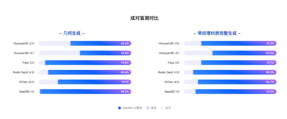 测评结果显示,Seed3D 2.0 在几何生成和端到端带材质资产生成两项核心任务上,相比所有参与对比的主流模型均呈现更高的偏好率,在专业测评中被显著感知。