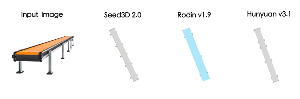 以一张工业传送带的示意图为例,Seed3D 2.0不仅还原了传送带主体,还推断出下方支撑腿的排列方式、整体的长宽比例、以及各组件之间的连接关系,生成结果在结构逻辑上与原图保持一致。