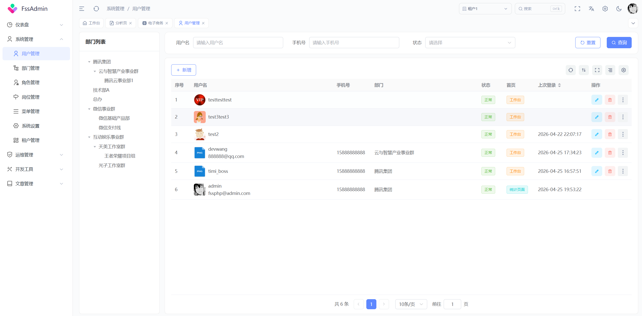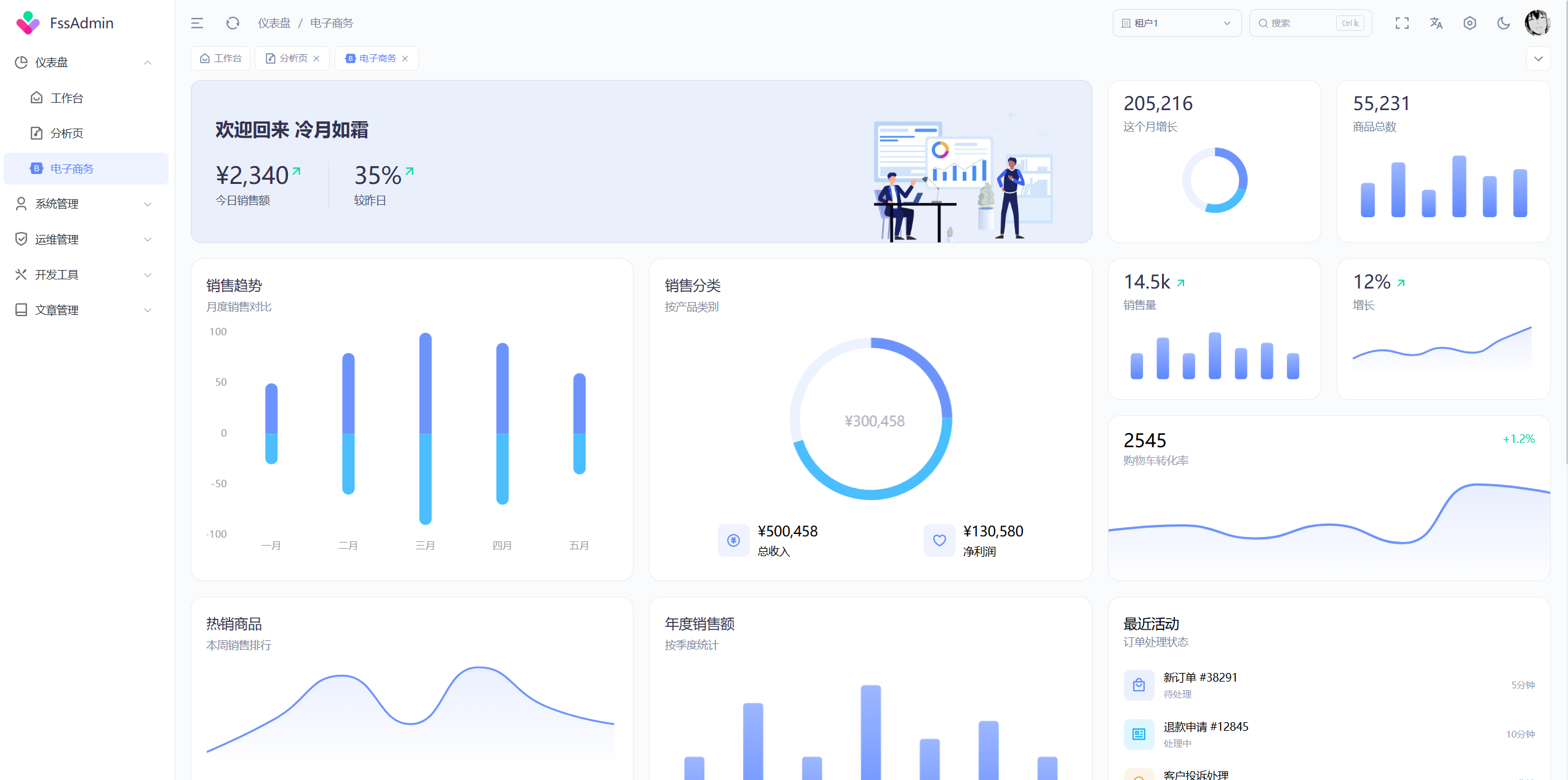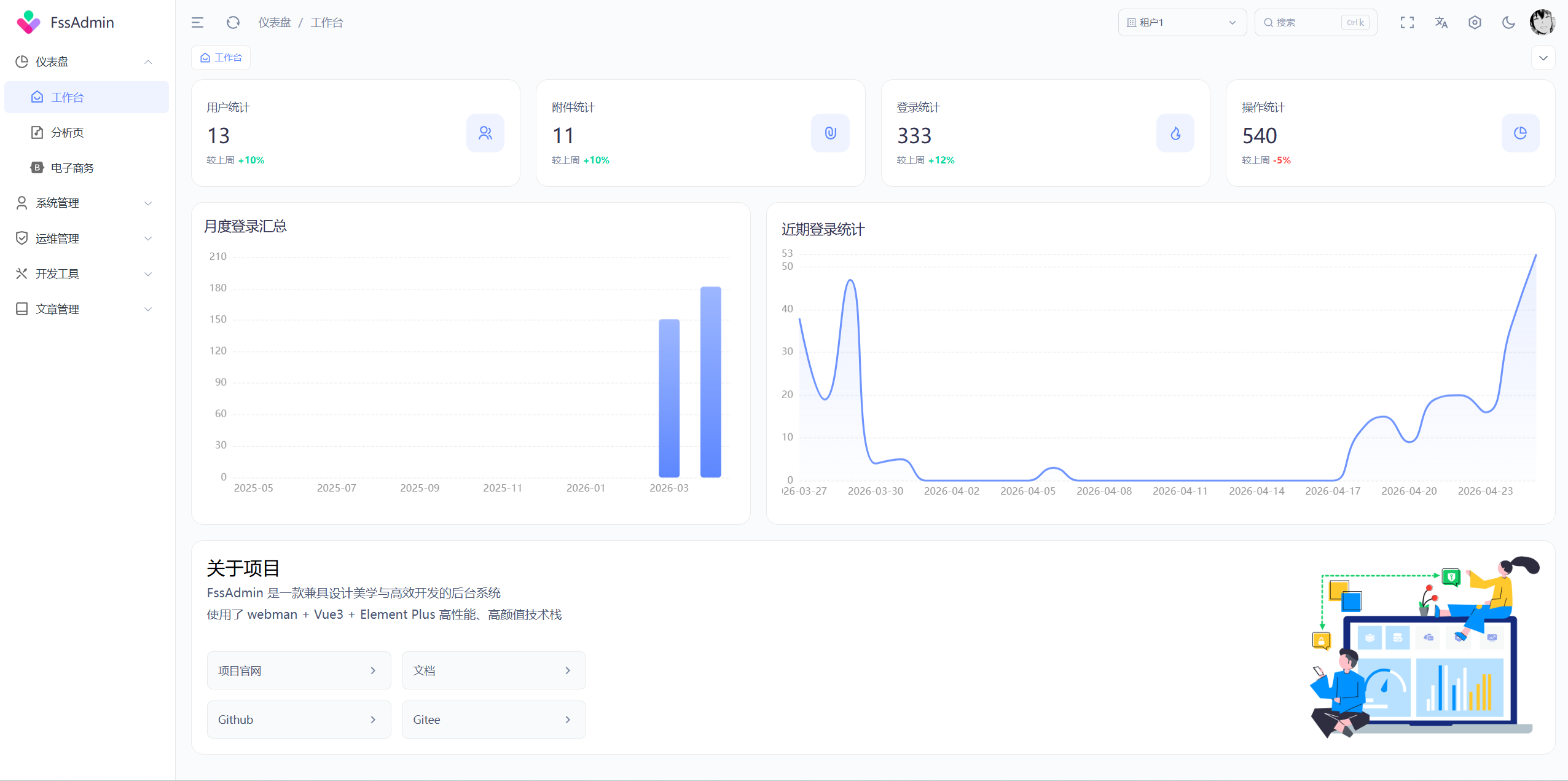 FssAdmin 是一款开源企业级别的中后台管理系统,基于 Vue3、Vite、TypeScript、Pinia、Pinia持久化插件、Unocss 和 ElementPlus等前端最新技术栈。相较于其他比较流行的后台管理模板,更加简洁、快捷和容易理解,对萌新小白十分友好。此项目学习成本非常低含有相关代码注释以及大量的案例,非常适合企业级项目、中小型项目、个人项目以及毕业设计。后续将用户、角色、菜单、字典管理和通用管理平台页面依次编写,做到直接对接后端接口即可,使之快速开发,适合企业级的OA,ERM,ERP,政务系统等开发。