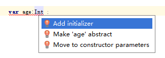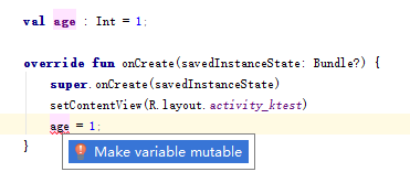 后续代码中对age常量进行赋值修改,提示 让 age这个常量 作为 变量类型。选中会发现 val age:Int = 1 --> var age:Int =1;