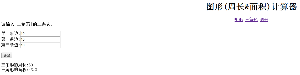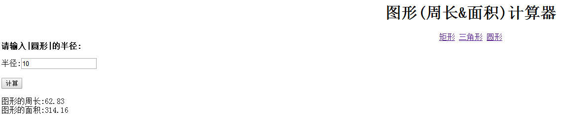 1 <html> 2 <head> 3 <title>图形计算器开发</title> 4 <meta http-equiv="Content-type" content="text/html;charset=utf-8"> 5 </head> 6 7 <body> 8 <center> 9 <h1>图形(周长&面积)计算器</h1> 10 11 <a href="index.php?action=rect">矩形</a> 12 <a href="index.php?action=triangle">三角形</a> 13 <a href="index.php?action=circle">圆形</a> 14 </center> 15 <?php 16 error_reporting(E_ALL & ~E_NOTICE); 17 function __autoload($className){ 18 include strtolower($className).".class.php"; 19 } 20 echo new Form("index.php"); 21 if(isset($_POST["sub"])){ 22 echo new Result(); 23 } 24 ?> 25 </body> 26 </html>
