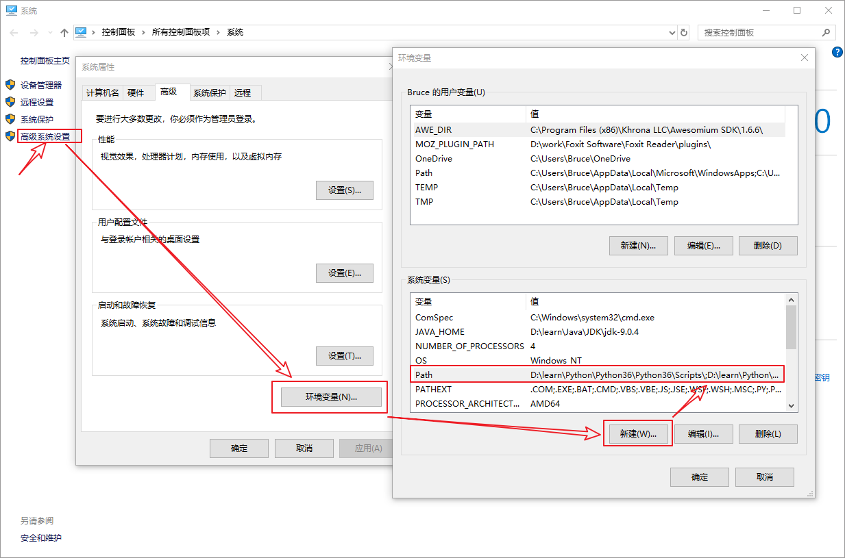 10、手动添加Python的环境变量,鼠标右键 此电脑 --> 属性 --> 点击高级系统设置 --> 点击环境变量 --> 点击PATH --> 在最后面加上我们的Python安装路径 --> 点击确定。如下图所示: