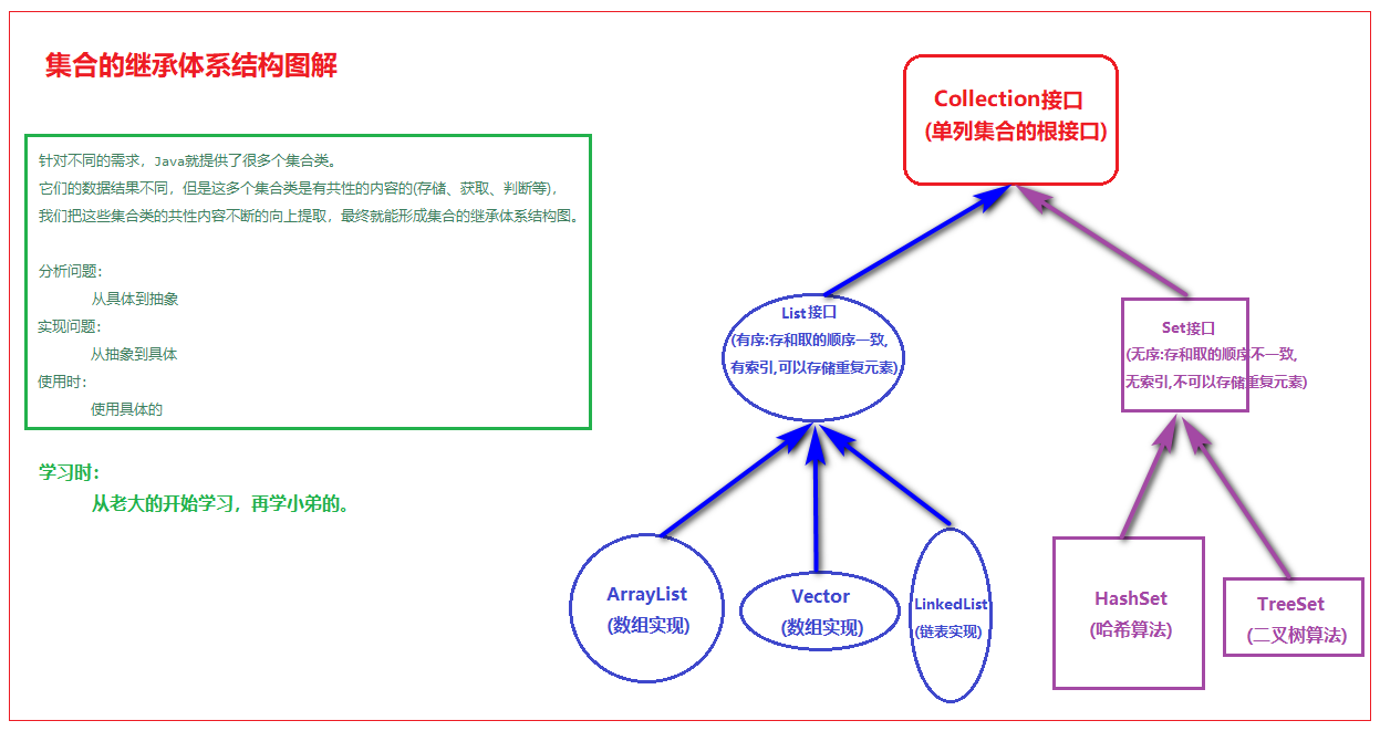 Collection接口是集合的顶层接口,它的子体系有重复的,有唯一的,有有序的,有无序的。(后面会慢慢的讲解)