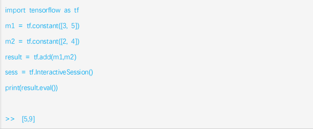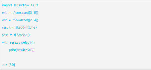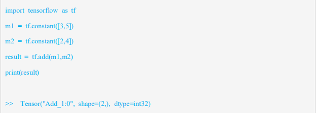 程序1定义了图的构建过程,“import tensorflow as tf”,是在python中导入tensorflow模块,并另起名为“tf”;接着定义了两个常量op,m1和m2,均为1*2的矩阵;最后将m1和m2的值作为输入创建一个矩阵加法op,并输出最后的结果result。