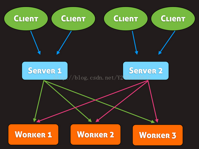 每个client连接多个server,并使用负载最低的那个server,当该server挂掉之后,gearman会自动切换到另一个server上,如下图所示: