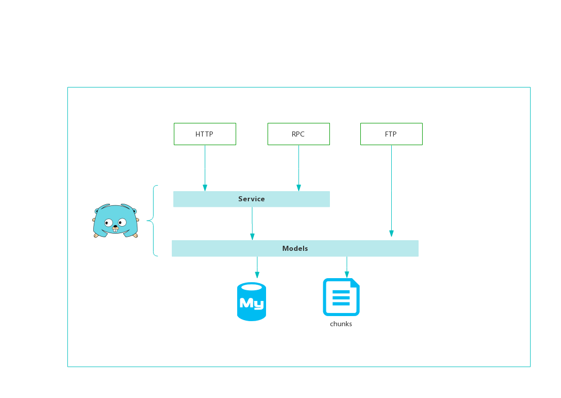 Bigfile 是使用 Golang 开发的一个文件传输管理系统,支持通过 HTTP API,RPC 调用以及 FTP 客户端管理文件。它构建于许多优秀的开源项目之上,基于数据库实现了一个虚拟的文件组织系统,在 Bigfile 中您可以看到熟悉的文件夹和文件,这种实现方式也是我们权限控制的基础。在底层,Bigfile 将任何文件切分成 1 MB 的文件块存储, 我们称之为 Chunk ,每个 Chunk 依据 sha256 算法计算 Hash 值相互区分,相同的 Chunk 只会被存储一次。 我们用一张图来展示 Bigfile 的设计架构图: