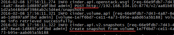 cinder-api 将接收到 snapshot volume 的请求。日志文件在 /opt/stack/logs/c-api.log。