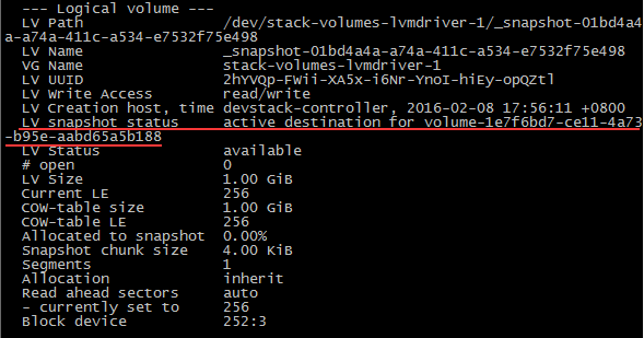 对于 LVM volume provider,snapshot 实际上也是一个 LV,同时记录了与源 LV 的 snapshot 关系,可以通过 lvdisplay 查看。