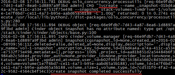 cinder-volume 执行 lvcreate 命令创建 snapshot。 日志为 /opt/stack/logs/c-vol.log。
