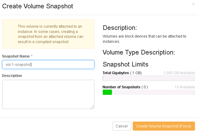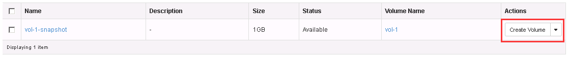 选择 volume “vol-1”,点击 “Create Snapshot”。