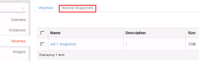 GUI 的 Volume Snapshots 标签中可以看到新创建的 “vol-1-snapshot”。